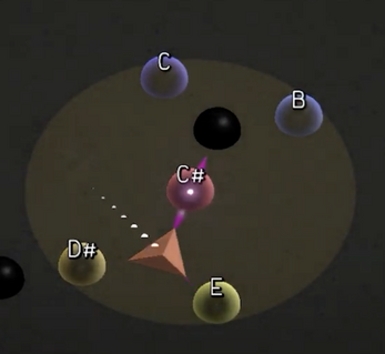 In H3, up to three player-performers use pitched sound to shape and activate an energetic grid. One player creates and maintains the rhythmic pulse, another guides movement across the map-score by playing sustained pitches, and the third activates 'planets' by improvising within different musical scales. Player roles swap during a performance, resulting in a range of emergent sonic combinations. Players are assisted by autonomous agents, who collect XP across three cycles.